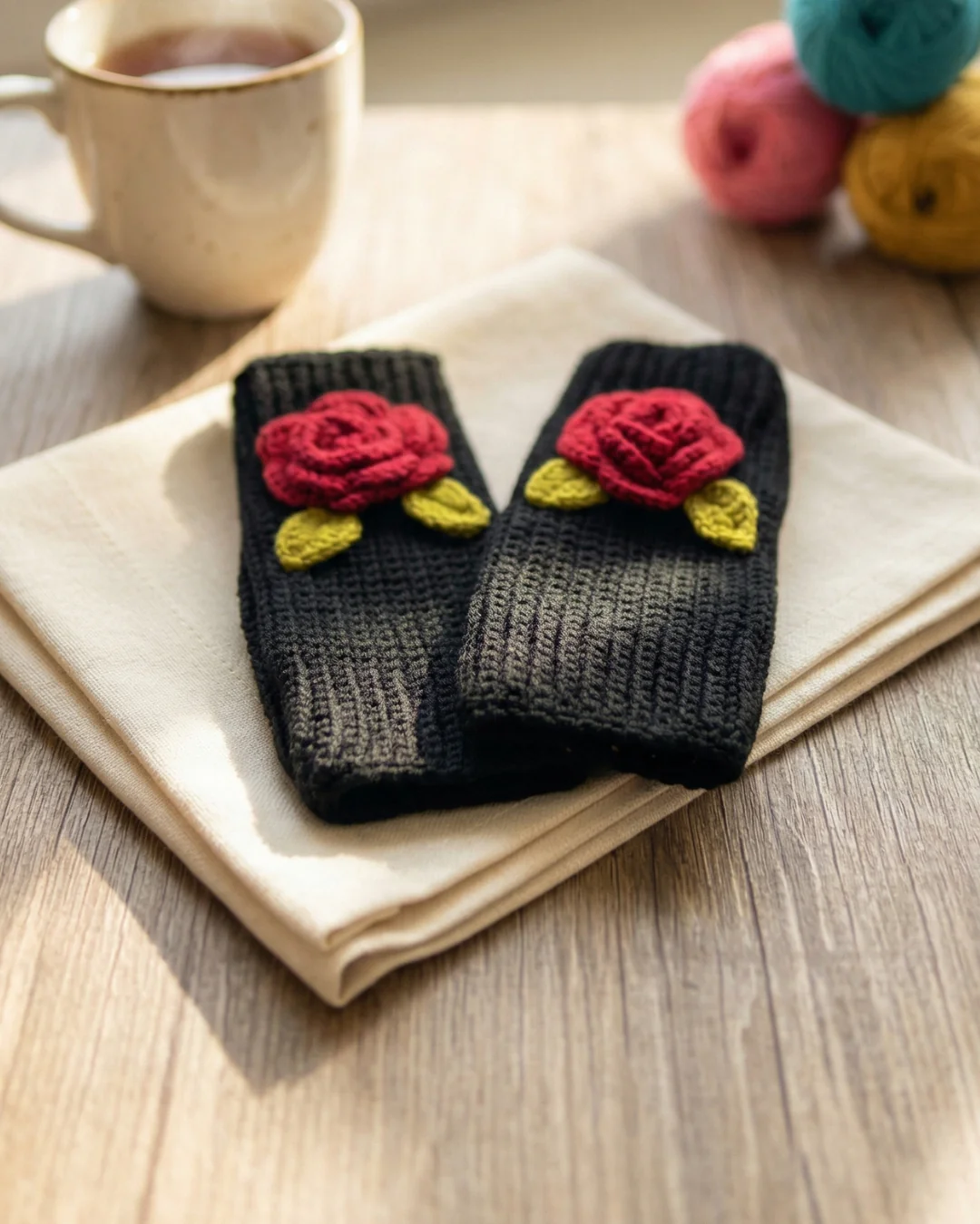 Cozy with a handcrafted charm, this pair of handmade wool knit gloves features a soft black ribbed base accented with a crocheted red rose and green leaf detailing. The textured knit provides warmth while maintaining flexibility and comfort for everyday wear.